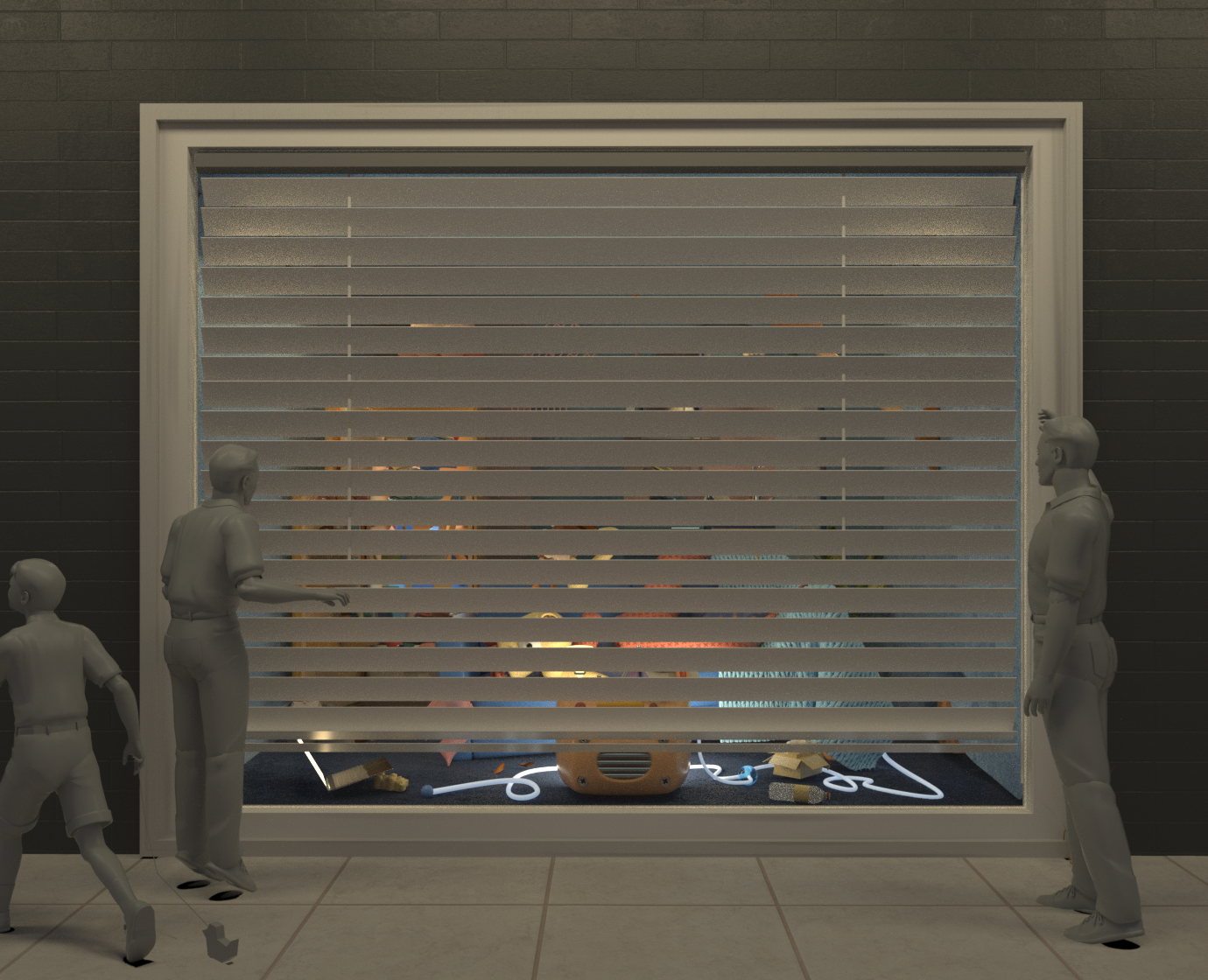 the blinds to peep into the scene inside it.